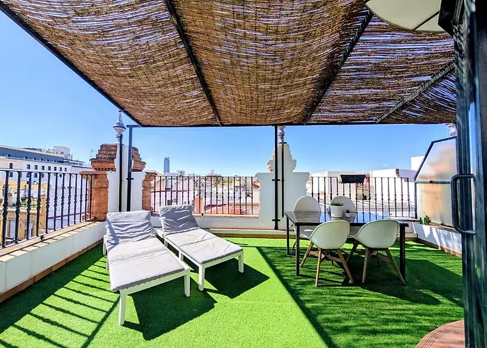 Air-Conditioned Duplex Penthouse In The Heart Of Seville est équipé d'une cuisine équipée pour ceux qui souhaitent faire sa propre cuisine. La station de métro Puerta de Jerez est à environ 15 minutes de marche de l'immeuble.